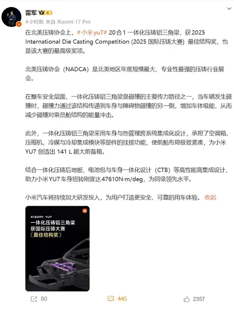 这一安全许诺在小米YU7车型上得到了充分表现。据最新职业音讯,在北美压铸协会主办的2025世界压铸大赛中,小米YU7所搭载的20合1一体化压铸铝三角梁荣获最佳结构奖,这一奖项是该赛事的最高荣誉。北美压铸协会作为北美区域压铸职业的标志性展会,其奖项的权威性备受业界认可。